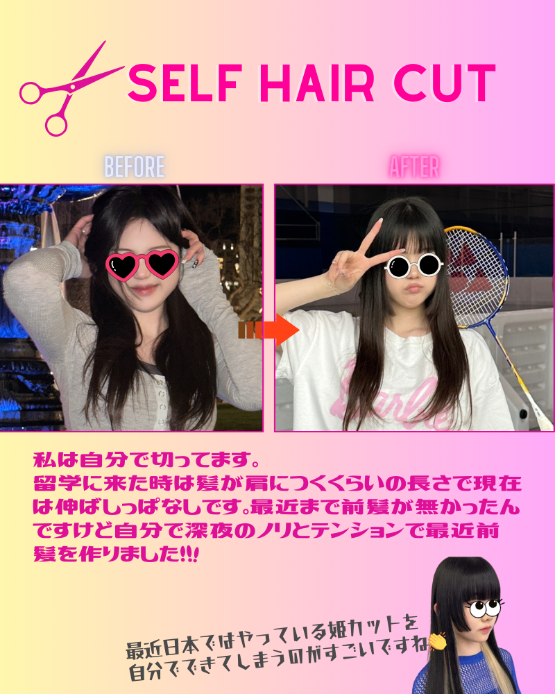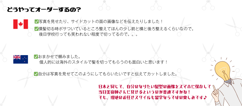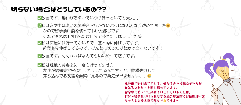 髪の毛どうしてる?留学中の散髪事情! 2024年5月3日 / KIRAのつぶやき / 床屋, 散髪, 留学中のヘアスタイル, 美容室 皆さんこんにちは!キラです🌟 「留学中、髪の毛伸びたらどうするの…?」と 気になる生徒さんは必ず1人以上はいるはずですよね! そんなギモンを少しでも緩和するために、 現在留学中の先輩たちにどうしているのかを聞いてみました🎤 聞いてみたところ、男の子は全員定期的に散髪に行っているようです💡 現地でパーマをかけるオシャレでチャレンジャーな生徒さんもいました! New Zealandに留学中の子は最寄りでカットしてる感じですが、 Canadaに留学中の生徒さんは日系、日本人が経営している 美容室に行ってる印象でした✂👦 そして女の子は殆ど切ってない派でした。 伸びてきたら結ぶ!っていうスタイルで過ごされている方が殆どですが、 中には自分で切っているという方もいました!👀 そして皆さんの気になる3ポイントを伺いました! ちなみにカナダの生徒さんはオススメの美容室を教えてくれました!バンクーバー周辺ですと、『Aube hair salon』だそうです。 ビクトリア周辺ですと2件ありまして、『Tango Salon』(公式インスタグラム)か、 『Three’s Company Hair Salon (スリーズカンパニー)』だそうです。 留学中の皆さん、散髪に対してのご回答ありがとうございました🌟 基本、現地にいったら現地に慣れる!ことが大切です。 自分にあった対処方法や参考情報をみつけて とりあえず自分でアクションしてみてくださいね~! 留学のご相談も受付中ですので、お気軽にご相談くださいませ! 留学無料相談はコチラから TOPページに戻る https://kira-international.com/ 高校留学専門のアットホームで信頼ができる、 そんな留学エージェントを目指しています。