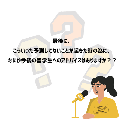 予想してないことが起こることに不安を感じると思いますが、それもいい機会だと思って楽しむことが大切だと思います。まだ留学が始まって二か月ほどしか経っていませんが留学する前に不安だったことは留学が始まって体験すると意外と小さなものだと感じました😌